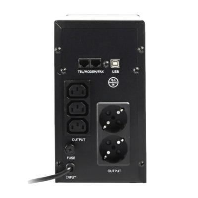● Тип: лінійний інтерактивний; ● Потужність: 2000 ВА (1200Вт); ● Апроксимована синусоїда; ● Розетки: 3× C13 (вихід), 2 евророзетки (вихід), USB-BF (вихід); ● Час перемикання: до 10 мілісекунд; ● Батареї: 2× 12В DC/9Аh; ● Час зарядки: до 8 годин; ● 125×380×225 мм